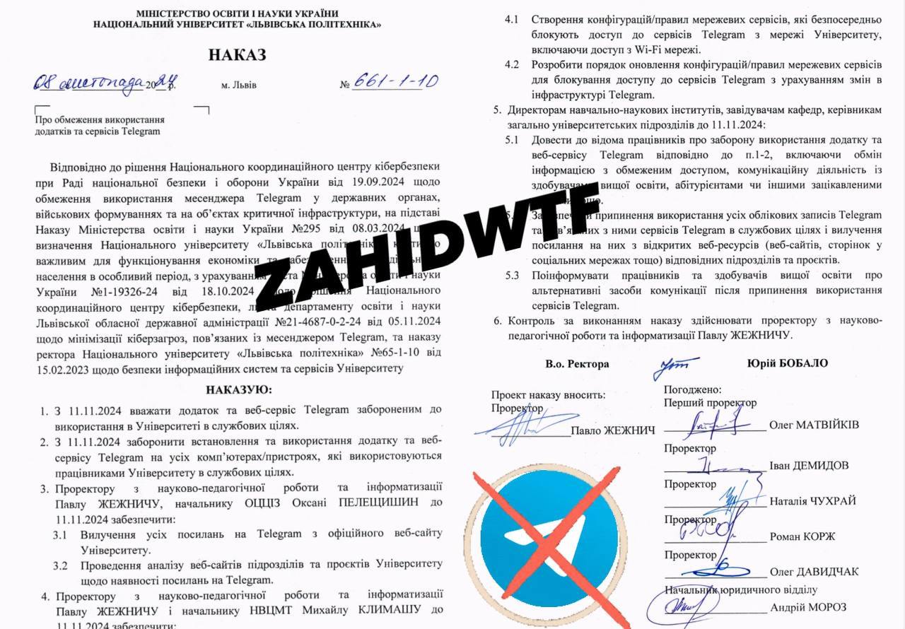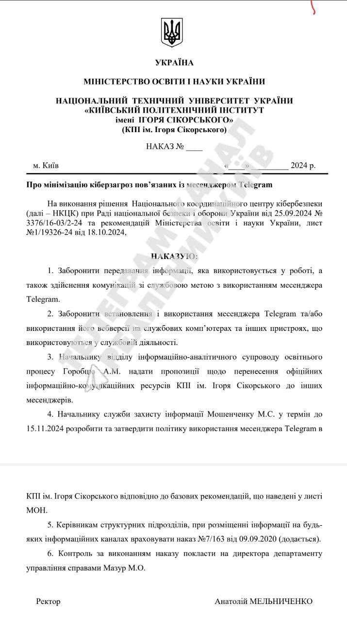 Между тем в украинских организациях и вузах Телеграм продолжают запрещать использовать в служебных целях. Недавно это сделали Национальный университет "Львовская политехника" и Киевский политехнический институт имени Игоря Сикорского, о чем свидетельствуют соответствующие приказы их ректоров, опубликованные в сети.
