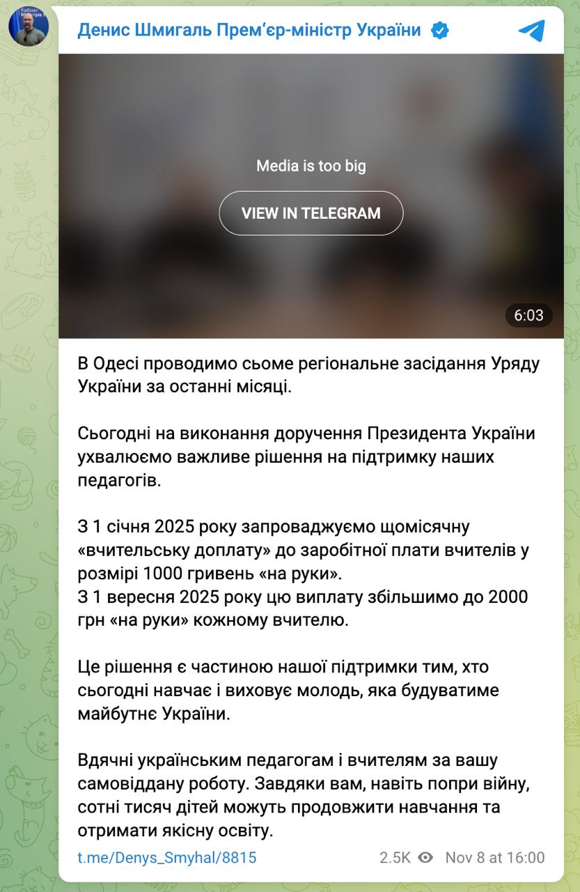 "С 1 января 2025 вводим ежемесячную "учительскую доплату" к заработной плате учителей в размере 1000 гривен на руки. С 1 сентября 2025 г. эту выплату увеличим до 2000 грн на руки каждому учителю. Это решение является частью нашей поддержки тем, кто сегодня учит и воспитывает молодежь, которая будет строить будущее Украины", - сказано в публикации главы Кабмина.