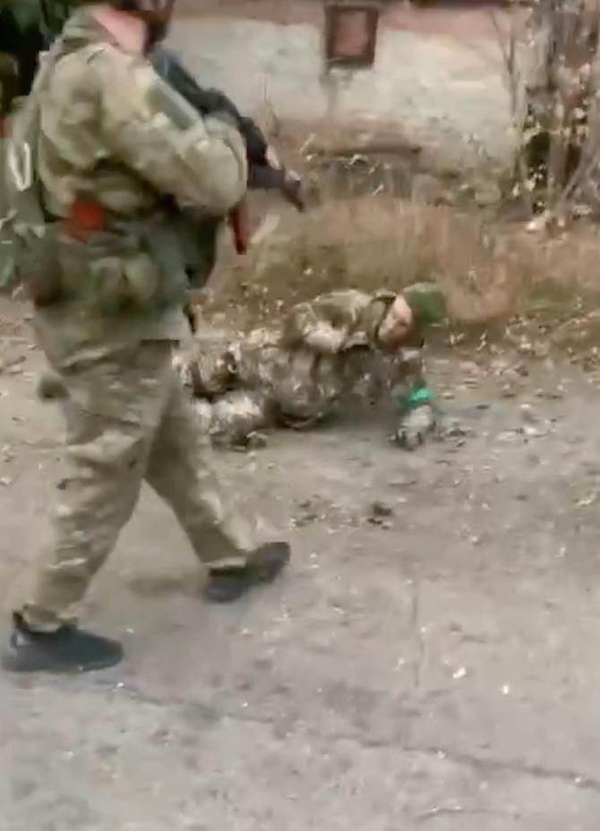 Потом подходит военный с автоматом и стреляет несколько раз в голову лежащему на земле украинцу. При этом за кадром другие россияне протестуют и говорят «Не надо».