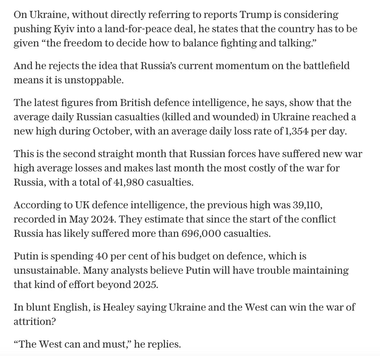 По его словам, последние данные британской военной разведки говорят о высоких потерях россиян. В октябре российская армия теряла в среднем 1354 человека убитыми и ранеными в сутки. Это максимум за всю войну, сказал министр.