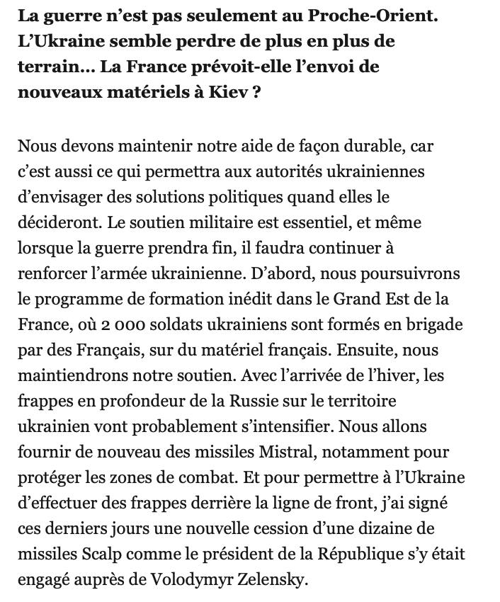 "Чтобы позволить Украине наносить удары за линией фронта, на днях я подписал передачу около десяти ракет Scalp, как это обещал сделать президент республики Владимиру Зеленскому", - заявил министр.