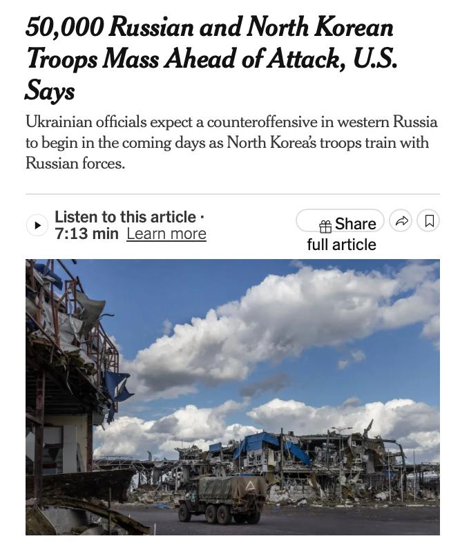 Украинские чиновники говорят, что ожидают наступления с участием северокорейских войск в ближайшие дни. На данный момент войска КНДР проходят боевое слаживание с россиянами в западной части Курской области.