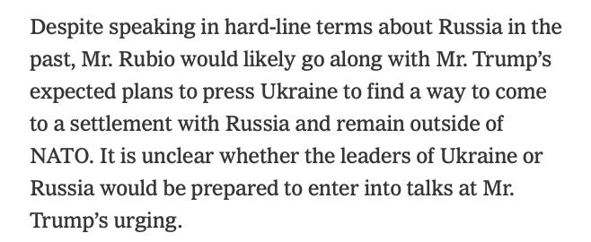 The New York Times пишет, что Марко Рубио будет отстаивать идею Трампа о "давлении" на Украину для урегулирования войны с РФ. Также он за то, чтобы не принимать Украину в НАТО.