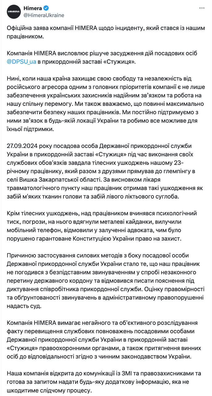 Украинская компания в области систем связи Himera заявила, что в Закарпатье пограничники избили ее 23-летнего сотрудника, приехавшего на отдых. Его обвинили в попытке сбежать за границу.