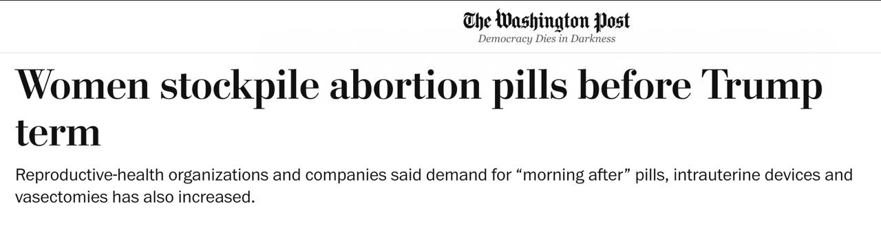 Один из крупнейших поставщиков таблеток для аборта Aid Access сообщил о получении 10 000 запросов на лекарства в течение 24 часов после объявления результатов выборов. Это примерно в 17 раз больше, чем обычное количество заказов за день. Just the Pill, организация, которая выписывает препараты для аборта с помощью телемедицины, заявила, что 22 из 125 ее заказов со среды по пятницу поступили от небеременных женщин. В организации отметили, что это редкость, когда кто-то просит о таком заранее. А Plan C, предоставляющий информацию о доступе к абортивным препаратам, сообщил о 82 200 посетителях своего сайта в среду. Для сравнения, перед выборами на сайте фиксировали 4 000 или 4 500 посетителей в день.
