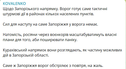 Также Коваленко пишет, что "Кураховское направление они (российские войска – Ред.) рассматривают как часть возможных действий в Запорожской области".