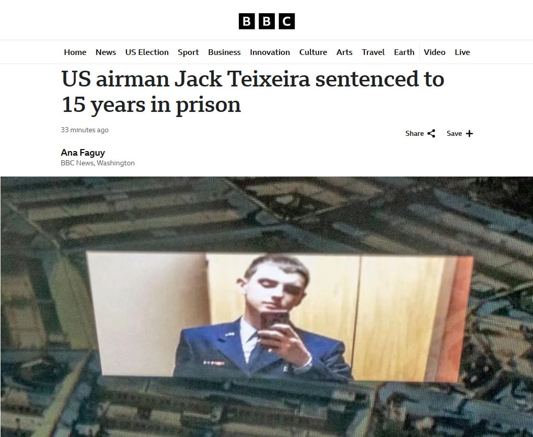 Суд в США приговорил к 15 годам тюрьмы военнослужащего ВВС Нацгвардии Джека Тейшейру, обвиняемого в утечке секретных документов Пентагона по Украине.