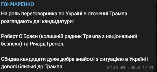 Народный депутат Алексей Гончаренко пишет, что на это место рассматриваются бывший советник Трампа по нацбезопасности Роберт О'Брайен и бывший и.о. директора нацразведки Ричард Гренелл.