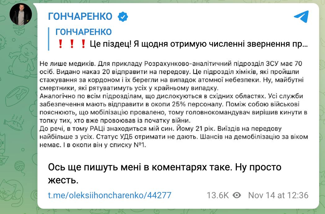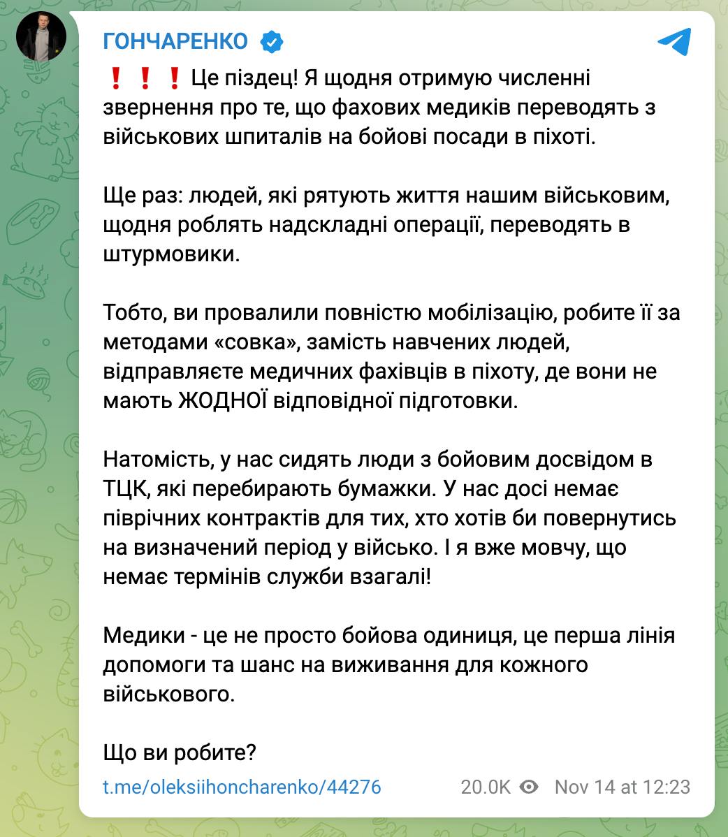 Гончаренко отмечает, что в то же время "у нас сидят люди с боевым опытом в ТЦК, которые перебирают бумажки" и "до сих пор нет полугодовых контрактов для тех, кто хотел бы вернуться на определенный период в армию".