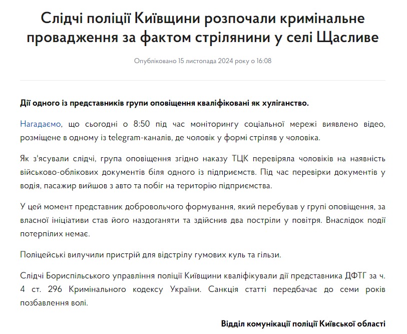 "Полицейские изъяли устройство отстрела резиновых шаров и гильзы. Следователи Бориспольского управления полиции Киевской области квалифицировали действия представителя ДФТО по ч. 4 ст. 296 Уголовного кодекса Украины. Санкция статьи предусматривает до семи лет лишения свободы", - говорится в публикации полиции.