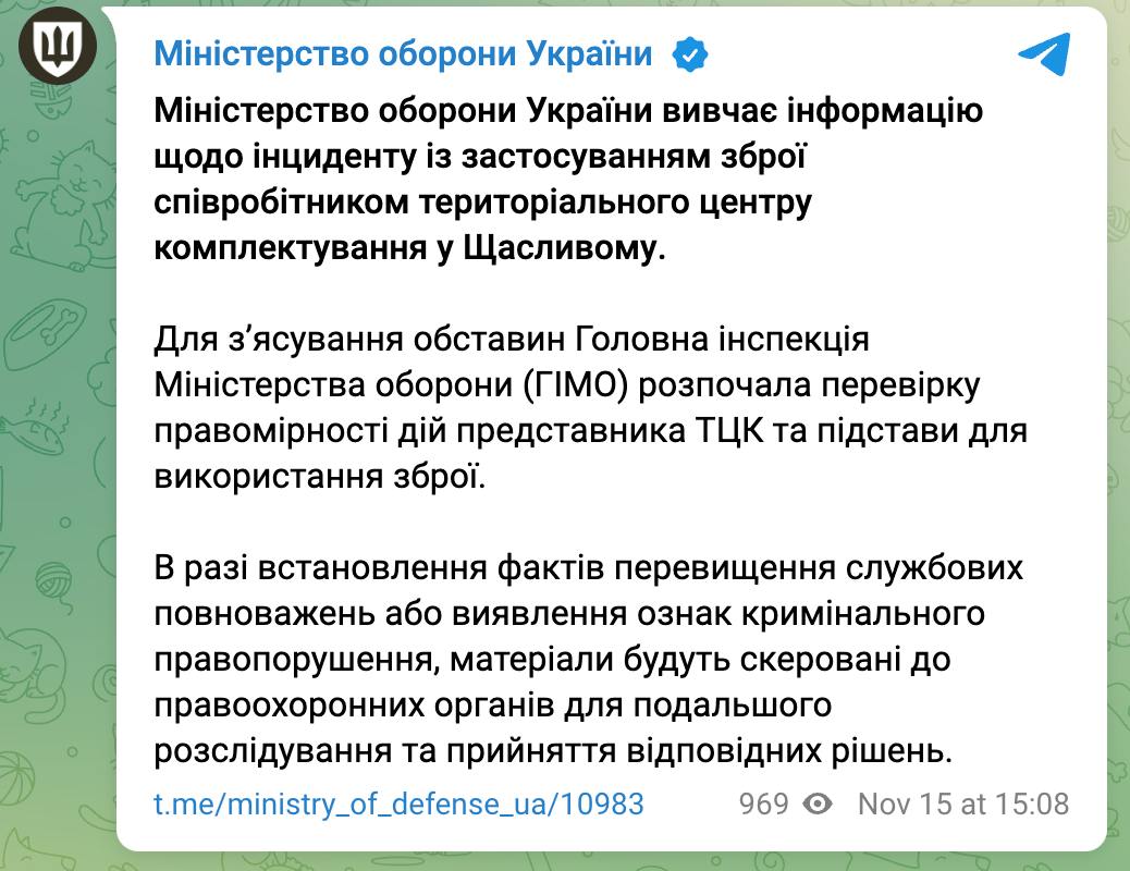 Однако Министерство обороны сообщило, что стрелял все-таки сотрудник ТЦК. Главная инспекция ведомства уже проводит расследование происшествия.