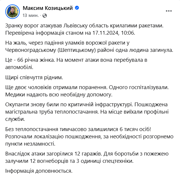 Во Львовской области россияне ударили по критической инфраструктуре, сообщил глава ОВА Максим Козицкий.