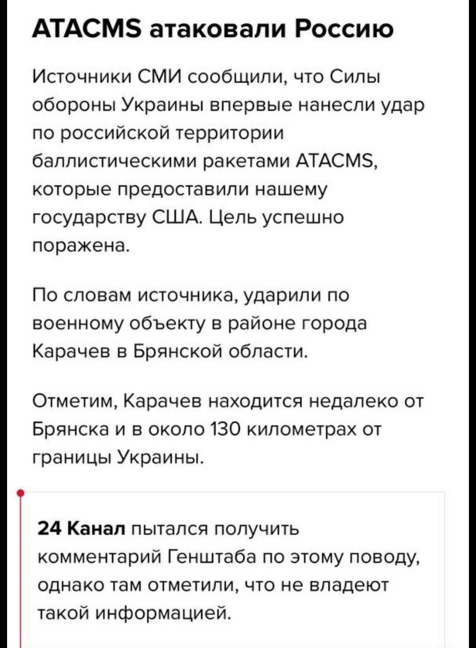 17.00 Американские источники The New York Times подтверждают, что Украина сегодня впервые ударила по территории РФ дальнобойными ракетами ATACMS.