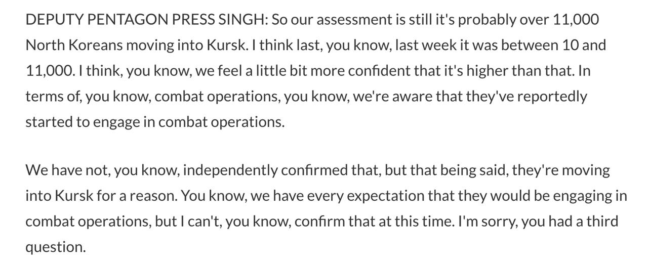 "Мы знаем, что они, как сообщается, начали участвовать в боевых операциях. Мы не получили независимого подтверждения этого, но они направляются в Курск по какой-то причине. У нас есть все основания полагать, что они будут участвовать в боевых действиях, но я не могу подтвердить это в данный момент", - заявила на брифинге представителя Минобороны Сабрина Сингх.