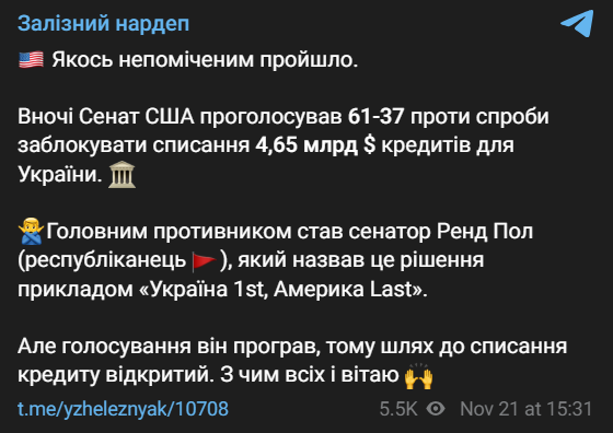 В то же время, народный депутат Ярослав Железняк сообщает, что в Сенате сегодня ночью уже состоялось голосование по инициативе Байдена списать с Украины 4,65 млрд долларов долга за военную помощь.