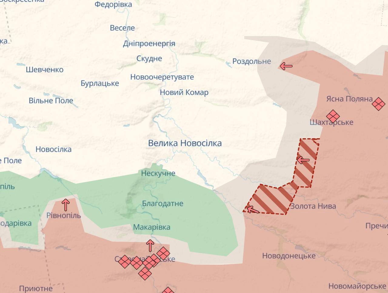 Карта Deep State показывает продвижение восточнее поселка около Золотой Нивы.