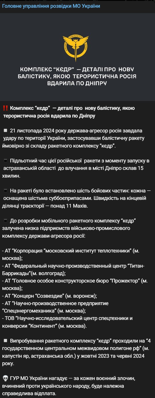 Вчера, 21 ноября, Россия ударила по Днепру баллистической ракетой, вероятно из состава ракетного комплекса "Кедр".