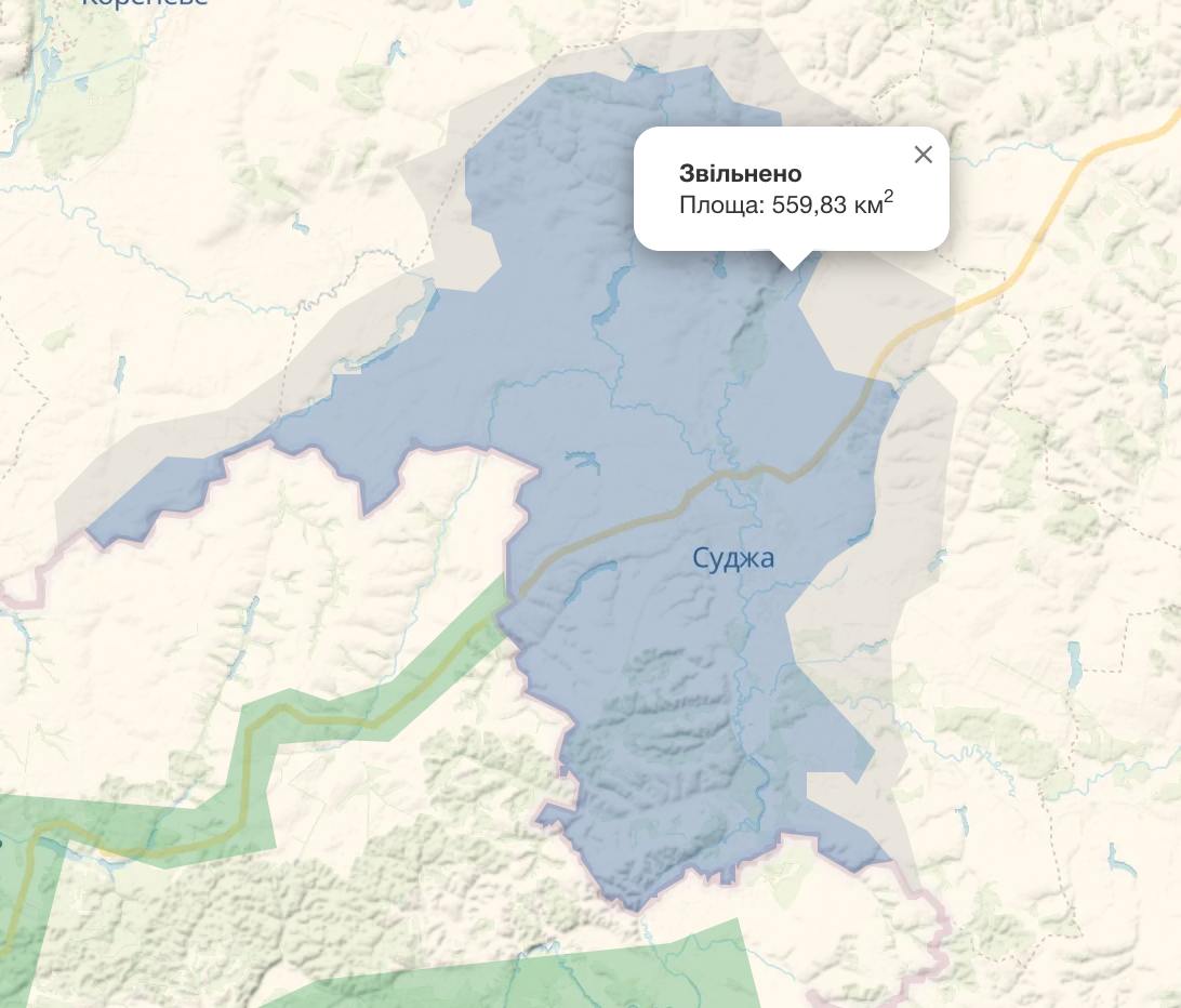 Однако украинский военный ресурс Deep State указывает сейчас контроль только над 559,83 квадратных километров. А российские телеграм-каналы называют ещё меньшую площадь: 450-500 квадратных километров.