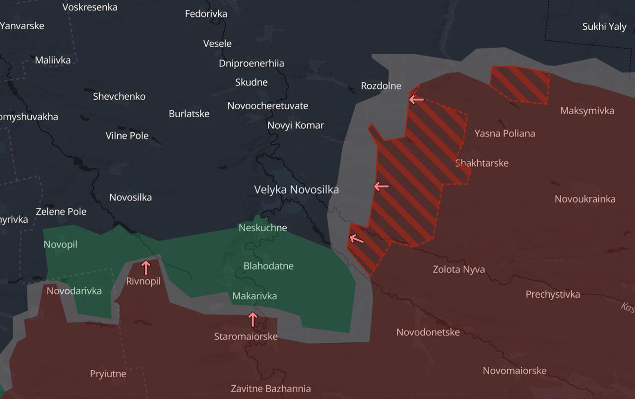 На левом фланге (к северо-востоку от Великой Новоселки) россияне "решают проблему" Раздольного и движутся на запад к селу Новый Комар.