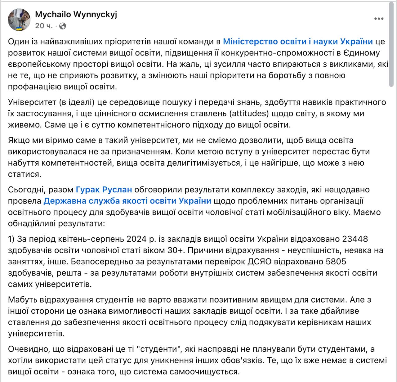 "Причины отчисления – неуспеваемость, неявка на занятия, прочее. Очевидно, что отчислены те "студенты", которые на самом деле не планировали быть студентами, а хотели использовать этот статус во избежание других обязанностей", - пишет Винницкий.