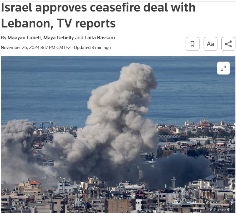 Израильские издания сообщают, что прекращение огня с Ливаном, как ожидается, вступит в силу завтра между 4:00 и 6:00 утра по местному времени.