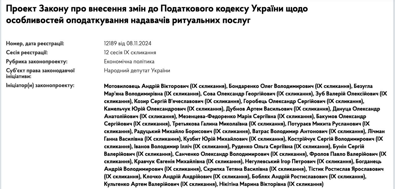 Проект закона №12189 под названием "О внесении изменений в Налоговый кодекс Украины касательно особенностей налогообложения поставщиков ритуальных услуг" опубликован на сайте парламента.