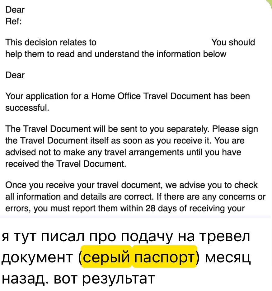 "Я тут писал про подачу на тревел документ (серый паспорт) месяц назад. Вот результат", - делится один из пользователей соцсетей, прилагая письмо от британских властей, что ему одобрили выдачу "серого паспорта".