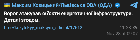 "Враг атаковал объекты энергетической инфраструктуры. Детали впоследствии", - написал глава ОВА Максим Козицкий.