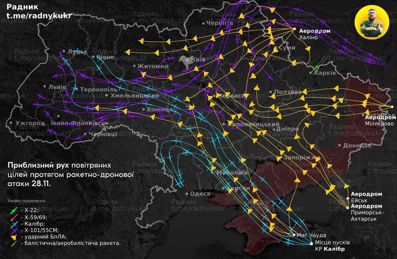 09:52 Карта ночной атаки по энергетике Украины.
