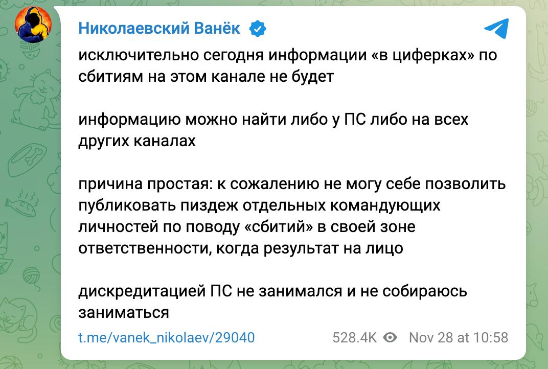 "Исключительно сегодня информации "в циферках" по сбитиям на этом канале не будет. Информацию можно найти либо у ПС либо на всех других каналах. Причина простая: к сожалению не могу себе позволить публиковать пи@деж отдельных командующих личностей по поводу "сбитий" в своей зоне ответственности, когда результат на лицо. Дискредитацией ПС не занимался и не собираюсь заниматься", - написал паблик.