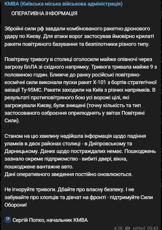 Тревога продолжалась почти 9,5 часов. Ближе к утру российские воздушно-космические силы выполнили пуск ракет Х-101 с бортов стратегической авиации Ту-95МС.