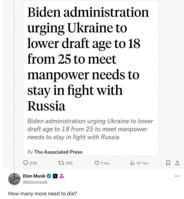 Между тем американский миллиардер и приближенный Дональда Трампа Илон Маск раскритиковал призывы администрации Джо Байдена к Украине снизить возраст мобилизации до 18 лет.