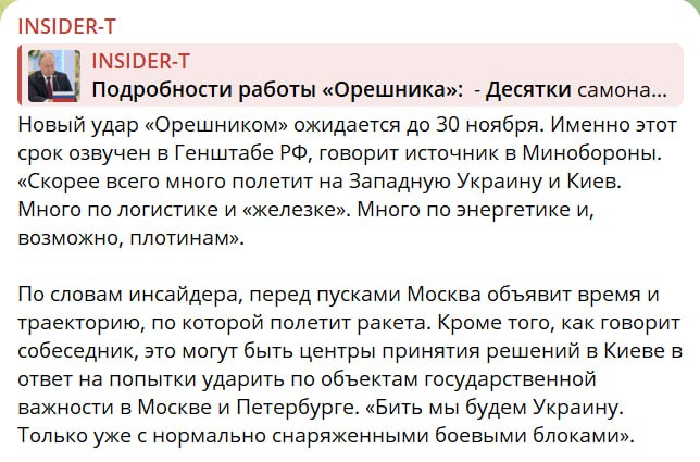 Каналы утверждают, что на этот раз удар будет нанесен "Орешником" с боевой частью. А накануне, 29 ноября, Владимир Путин предупредит украинцев о намеченном ударе.