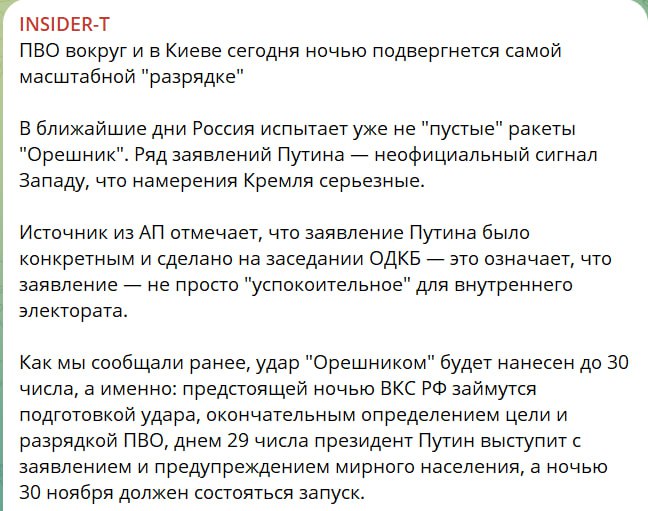 В украинских-телеграм каналах разгоняется информация о якобы намеченном в ночь на 30 ноября ударе системой "Орешник" по Киеву и другим городам.