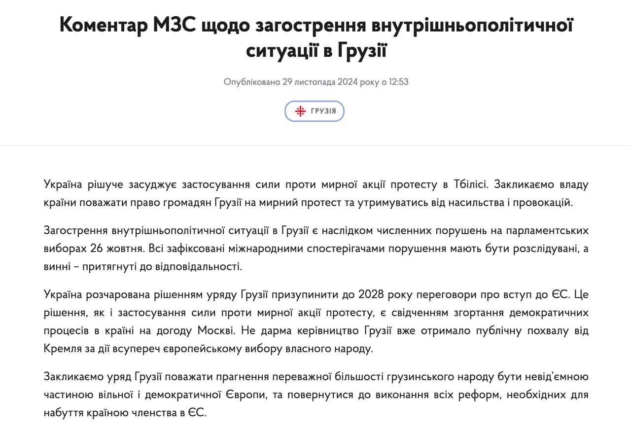 Также Украина заявляет, что "разочарована решением правительства Грузии приостановить до 2028 года переговоры о вступлении в ЕС", что наряду с разгоном протестов называет "сворачиванием демократических процессов в стране в угоду Москве".