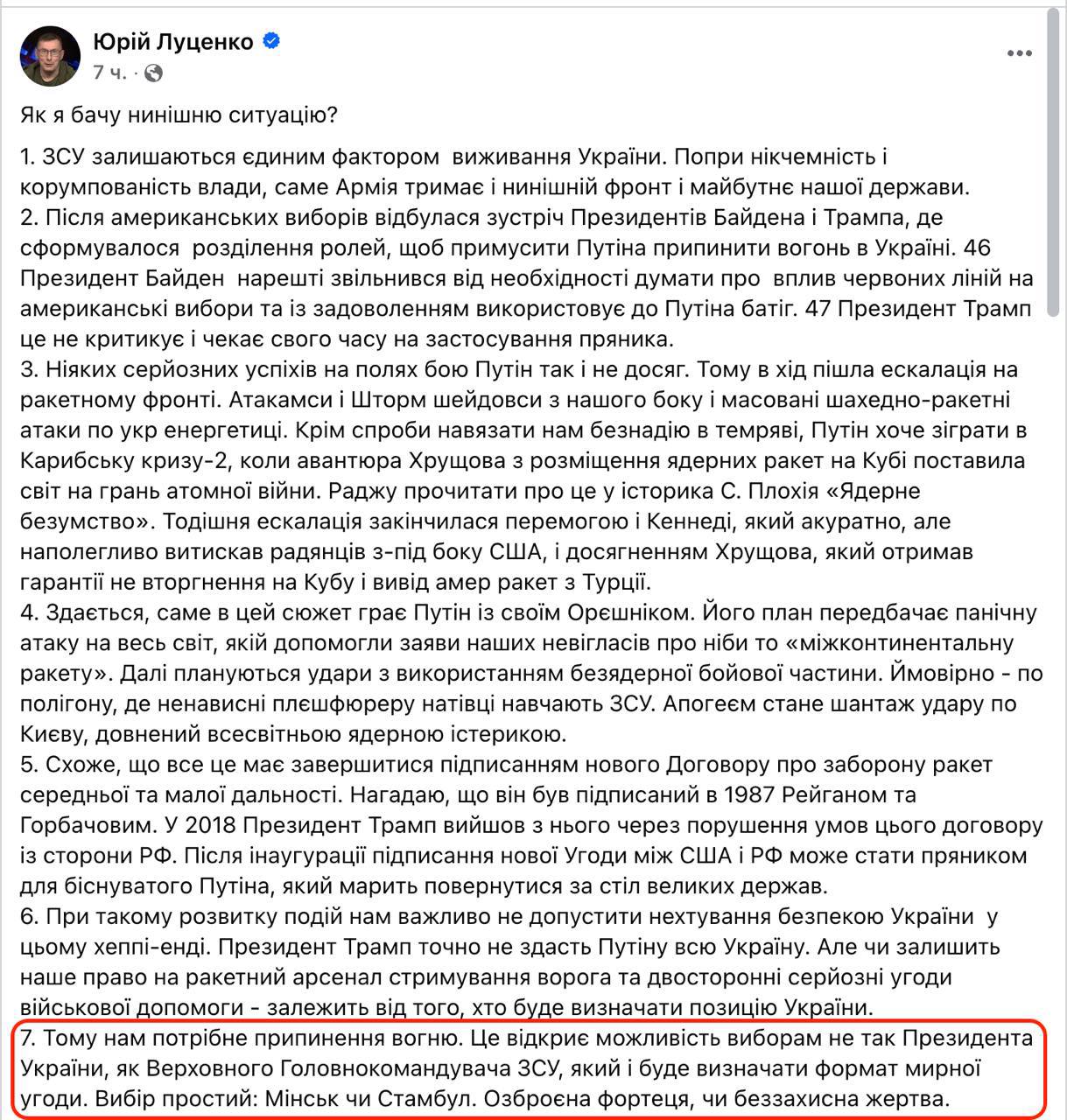 "Президент Трамп точно не сдаст Путину всю Украину. Но оставит ли наше право на ракетный арсенал сдерживания врага и двусторонние серьезные соглашения о военной помощи, зависит от того, кто будет определять позицию Украины. Поэтому нам нужно прекращение огня. Это откроет возможность провести выборы не столько президента Украины, сколько верховного главнокомандующего, который и будет определять формат мирного соглашения. Выбор прост: Минск или Стамбул. Вооруженная крепость или беззащитная жертва", - написал Луценко, анализируя нынешнее положение дел.