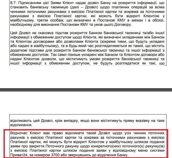 При этом в договоре Приватбанка для человека предусмотрена возможность отозвать свое разрешение на раскрытие банковской тайны под нацкешбэк.
