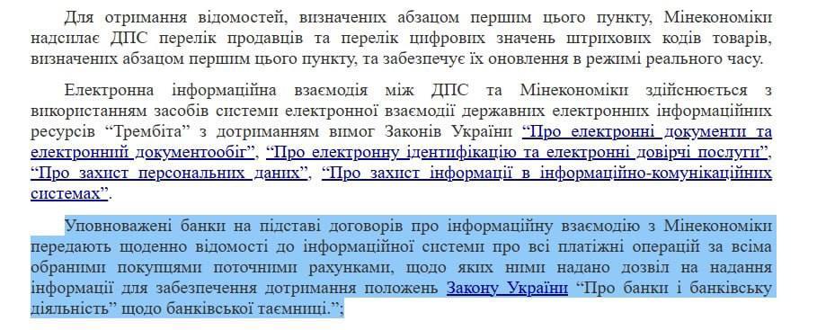Он также заявляет, что банк передает данные только по платежам в торговых сетях, участвующих в программе — картой через POS-терминал. Если украинец рассчитывается в другом месте, никакие сведения о платеже не передаются. Также информация не уходит из банка при прочих переводах денег, например, при p2p-переводах (по номерам карт физлиц) или IBAN-перечислениях.