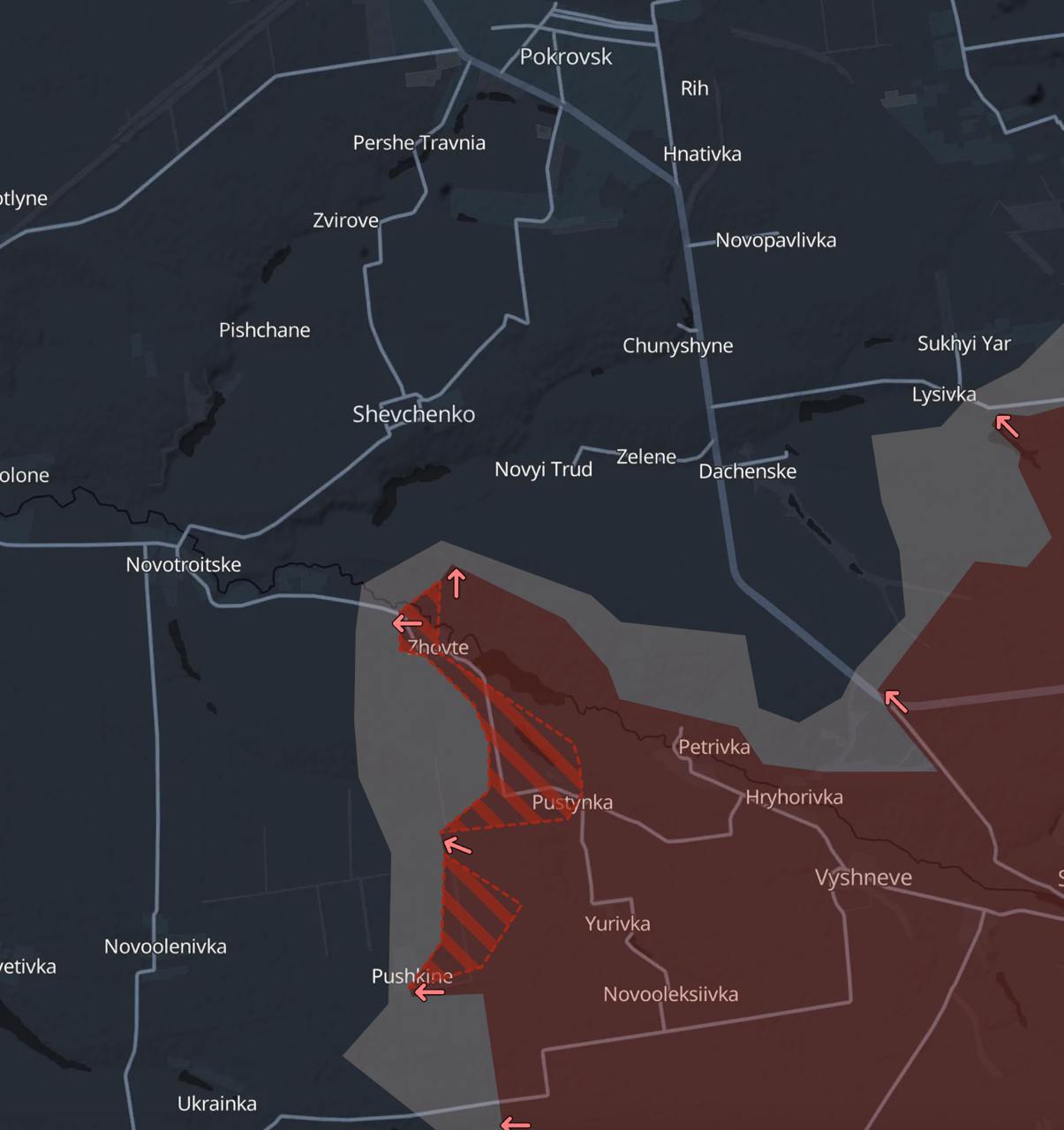 «Южнее населенного пункта Пушкино враг начал двигаться к Украинке. До восточных окрестностей осталось пройти им примерно один километр. Также продолжается движение к трассе Покровск-Курахово, до нее осталось пройти три километра. В направлении Желтого противник также продвинулся вглубь на запад и вышел к окрестностям Новопустынки. Таким образом, расширяется прорыв вдоль железной дороги на Покровск и создается угроза охвата с запада», - пишет военный.