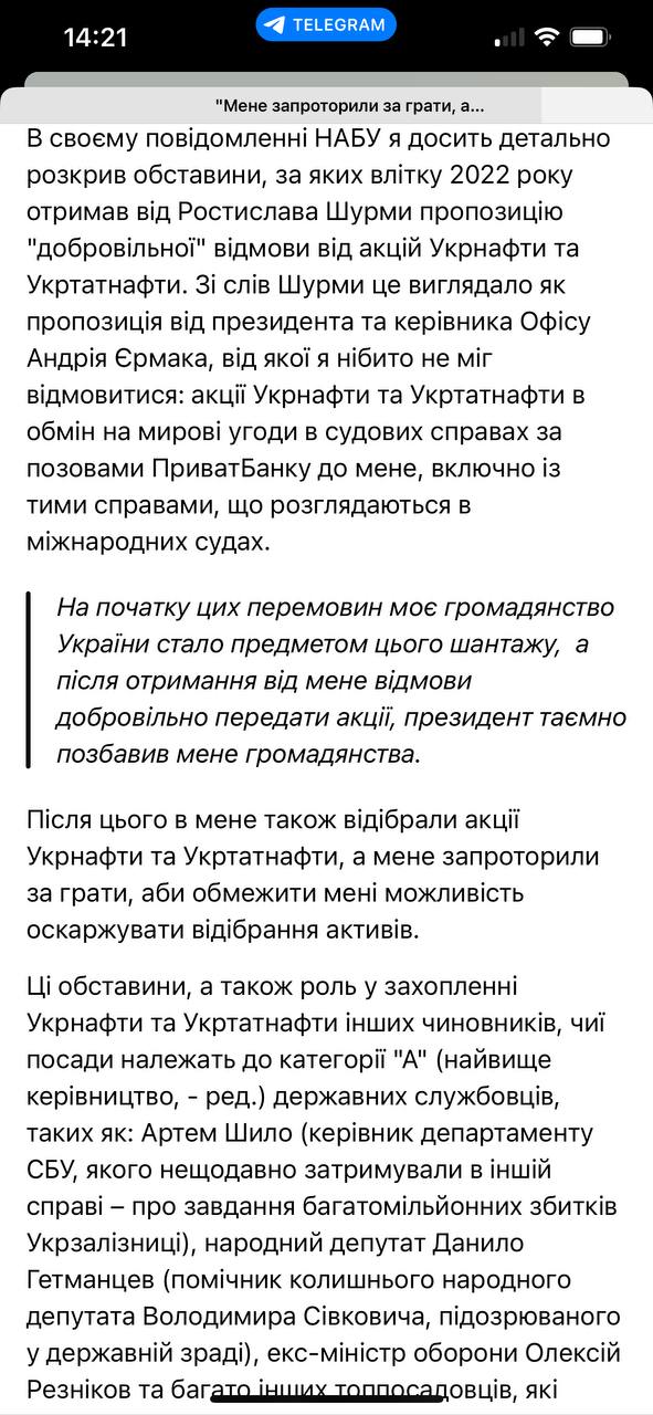 Он также говорит, что с предложением отдать акции "Укрнафты" к нему ещё летом 2022 года приходил заместитель главы Офиса президента Ростислав Шурма. Как утверждает Коломойский, Шурма заявил, что действует по поручению Зеленского и главы ОП Андрея Ермака. Также Коломойский говорит, что лишение его украинского гражданства летом 2022 года было попыткой оказать давление на него в вопросе "Укрнафты".