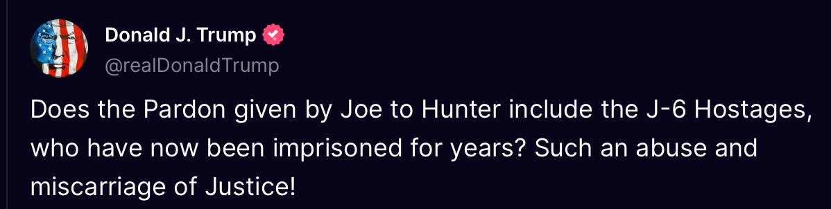 "Распространяется ли помилование, данное Джо Хантеру, на заложников 6 января (обвиняемых в штурме Капитолия 6 января 2021 года - Ред.), которые уже много лет находятся в заключении? Такое злоупотребление и нарушение правосудия!" - написал Трамп в соцсети Truth.