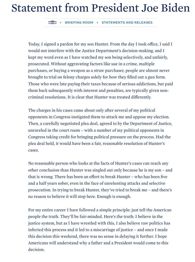 "С первого дня в этой должности я говорил, что не буду вмешиваться в принятие решений Министерством юстиции, и я сдержал слово, даже когда видел, как моего сына выборочно и несправедливо преследуют", - говорится в заявлении Байдена.