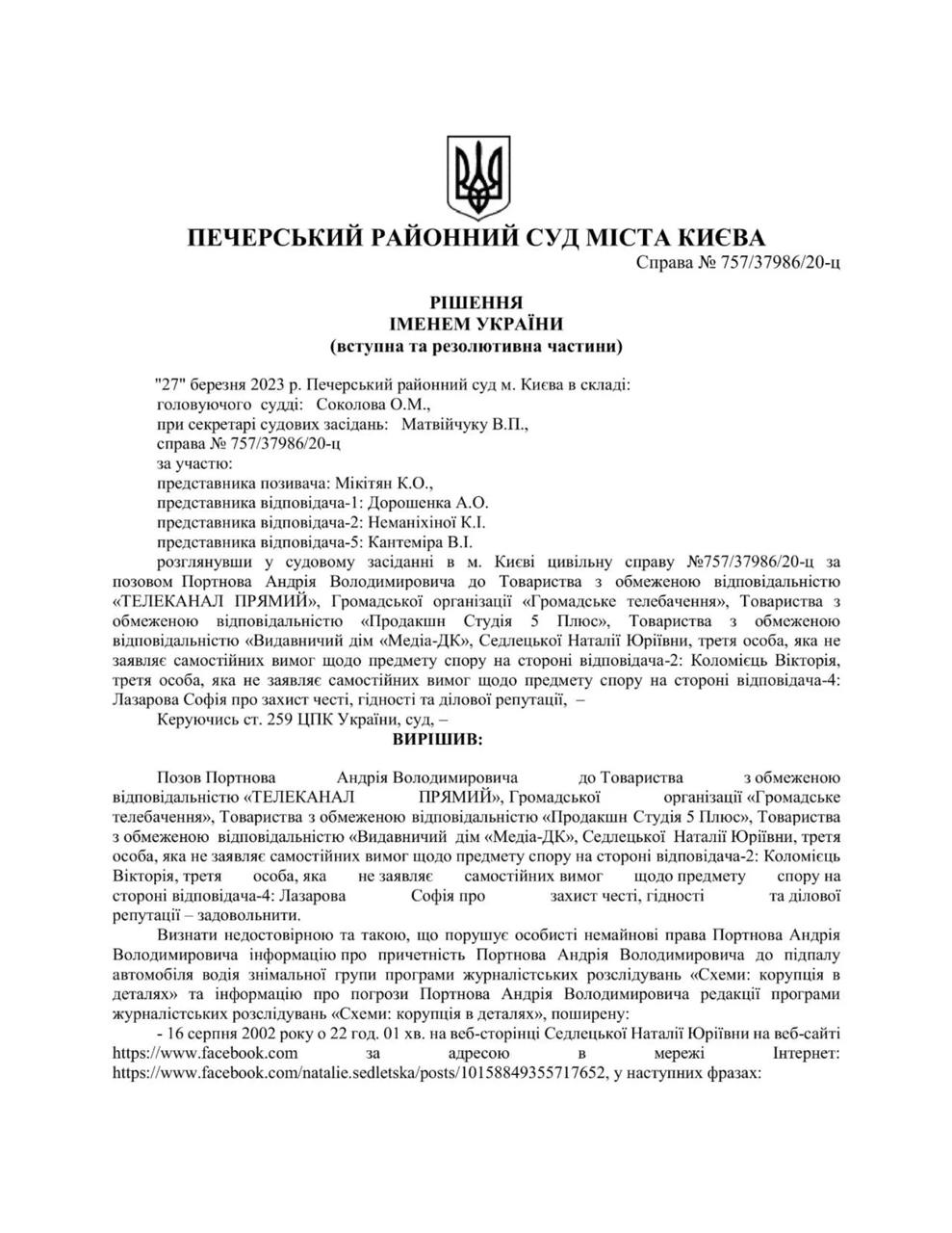 Печерский районный суд Киева признал недостоверной информацию, распространенную некоторыми украинскими СМИ, включая и "Громадське", о якобы причастности Портнова к поджогу автомобиля водителя программы "Схемы: коррупция в деталях". В 2020 году издание опубликовало заявление руководителя программы "Схемы" на "Радио Свобода" Натальи Седлецкой о том, что Портнов может быть причастен к поджогу их редакционного автомобиля. Как сказано в решении суда, эта информация не только недостоверна, но и нарушает личные неимущественные права Портнова.