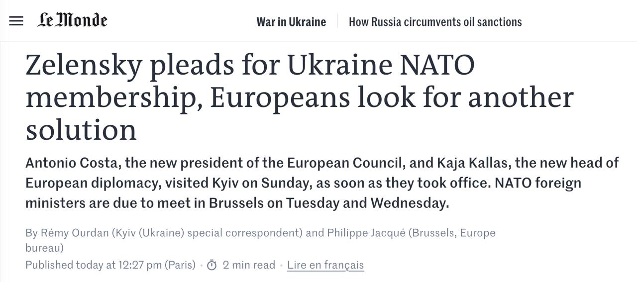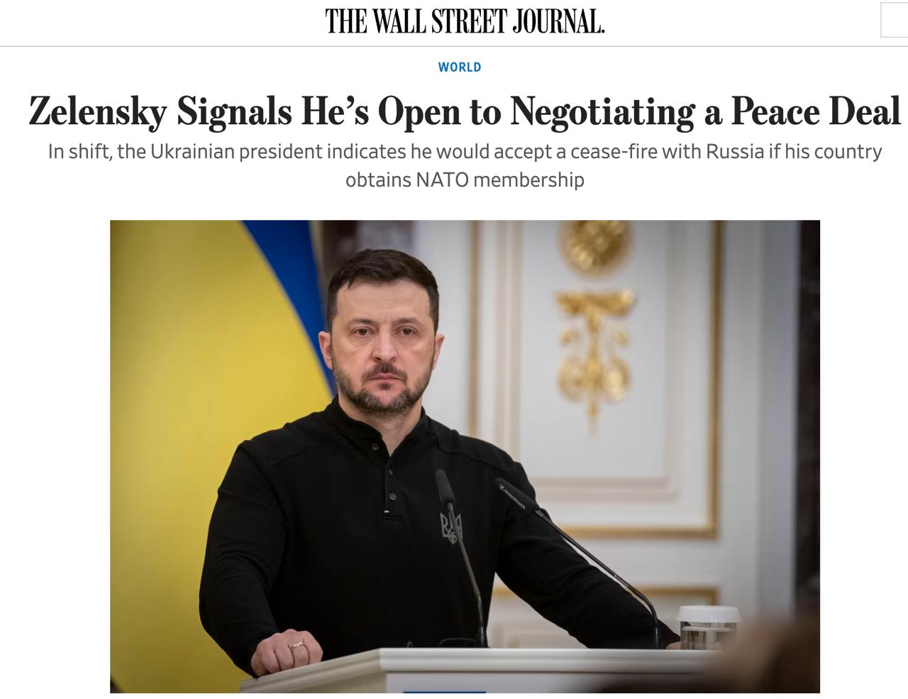 Владимир Зеленский "меняет свою риторику", говоря о готовности прекратить войну по линии фронта в обмен на приглашения в НАТО. Однако приглашение в Альянс сейчас маловероятно: чиновники в Вашингтоне, Берлине и других столицах "обеспокоены тем, что сближение Украины с Альянсом может обострить конфронтацию Запада с Москвой".