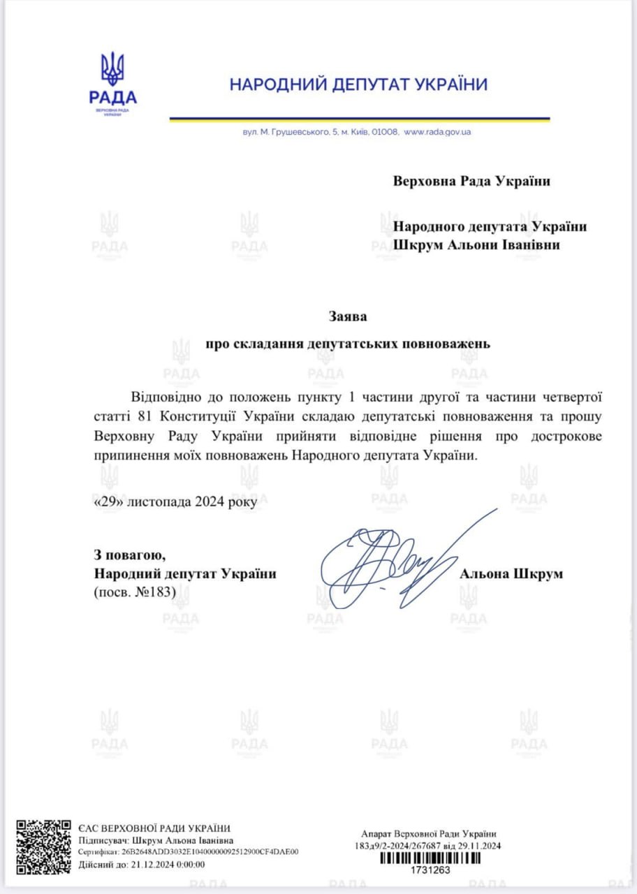 Шкрум сложила мандат буквально только что. Вчера она написала соответствующее заявление, о чем рассказала в своем Фейсбуке.