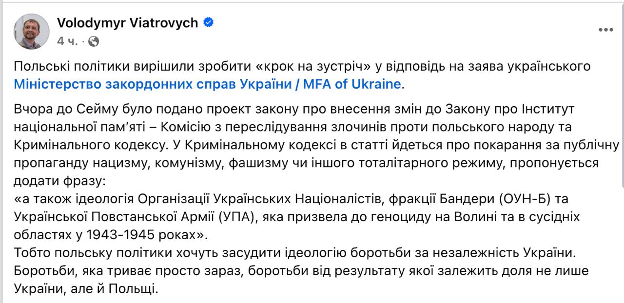 "Вчера в Сейме был представлен проект закона о внесении изменений в закон об Институте национальной памяти – о Комиссии по преследованию преступлений против польского народа и Уголовном кодексе. В Уголовном кодексе в статье, где говорится о наказании за публичную пропаганду нацизма, коммунизма, фашизма или иного тоталитарного режима, предлагается добавить фразу: "а также идеология Организации украинских националистов, фракции Бандеры (ОУН-Б) и Украинской повстанческой армии (УПА), которая привела к геноциду на Волыни и в соседних областях в 1943-1945 годах". То есть польские политики хотят осудить идеологию борьбы за независимость Украины. Борьбы, которая продолжается прямо сейчас, от результата которой зависит судьба не только Украины, но и Польши", - написал Вятрович.