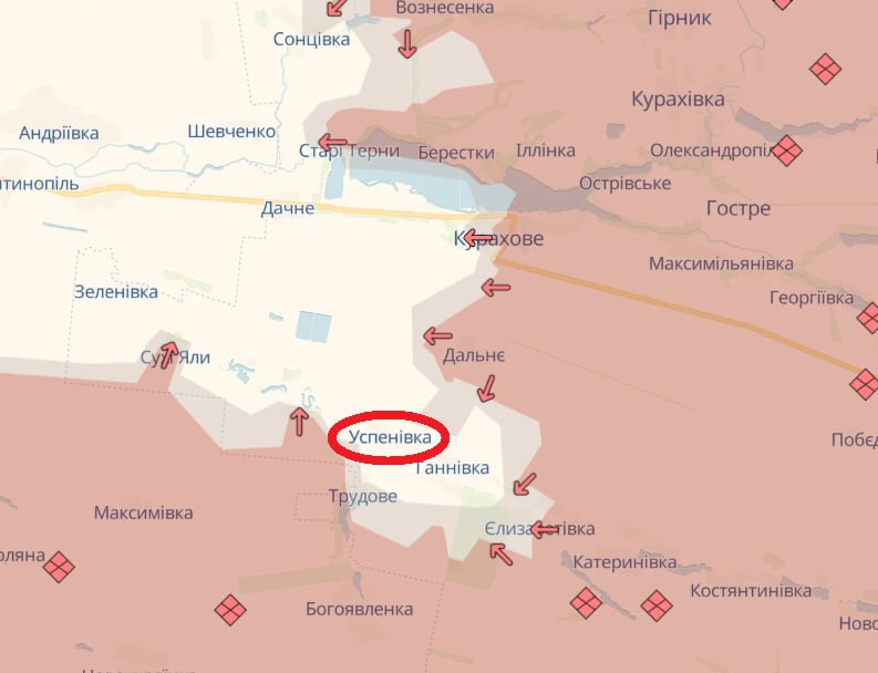 Российские телеграм-каналы тоже пишут о прорыве армии РФ к Успеновке. Успеновка - село, взятие которого россиянами будет означать фактическое окружение украинских подразделений в "кармане" восточнее.