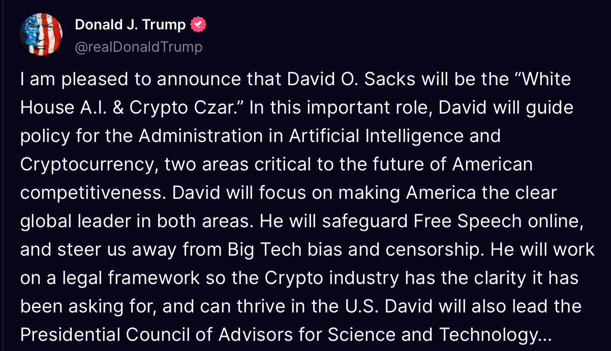 Трамп заявил, что назначает его своим "царем" по вопросам искусственного интеллекта и криптовалют.