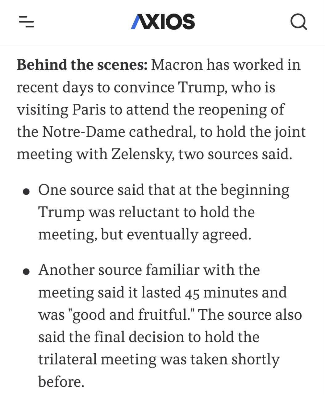 Напомним, оба президента прилетели в Париж на открытие восстановленного после пожара собора Парижской Богоматери. Затем Зеленского и Трампа пригласил к себе Макрон и провел с ними трехстороннюю встречу, длившуюся около получаса.