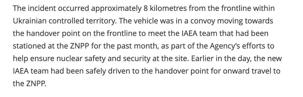 При этом МАГАТЭ уже официально подтвердило, что автомобиль был атакован на территории, подконтрольной Украине - примерно в восьми километрах от линии фронта. Ни к одной из сторон агентство обвинений не выдвигало.